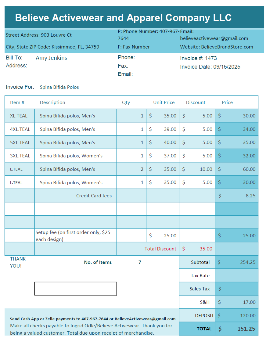 [BALANCE DUE AT TIME OF DELIVERY (Including Credit card fees): $151.25]